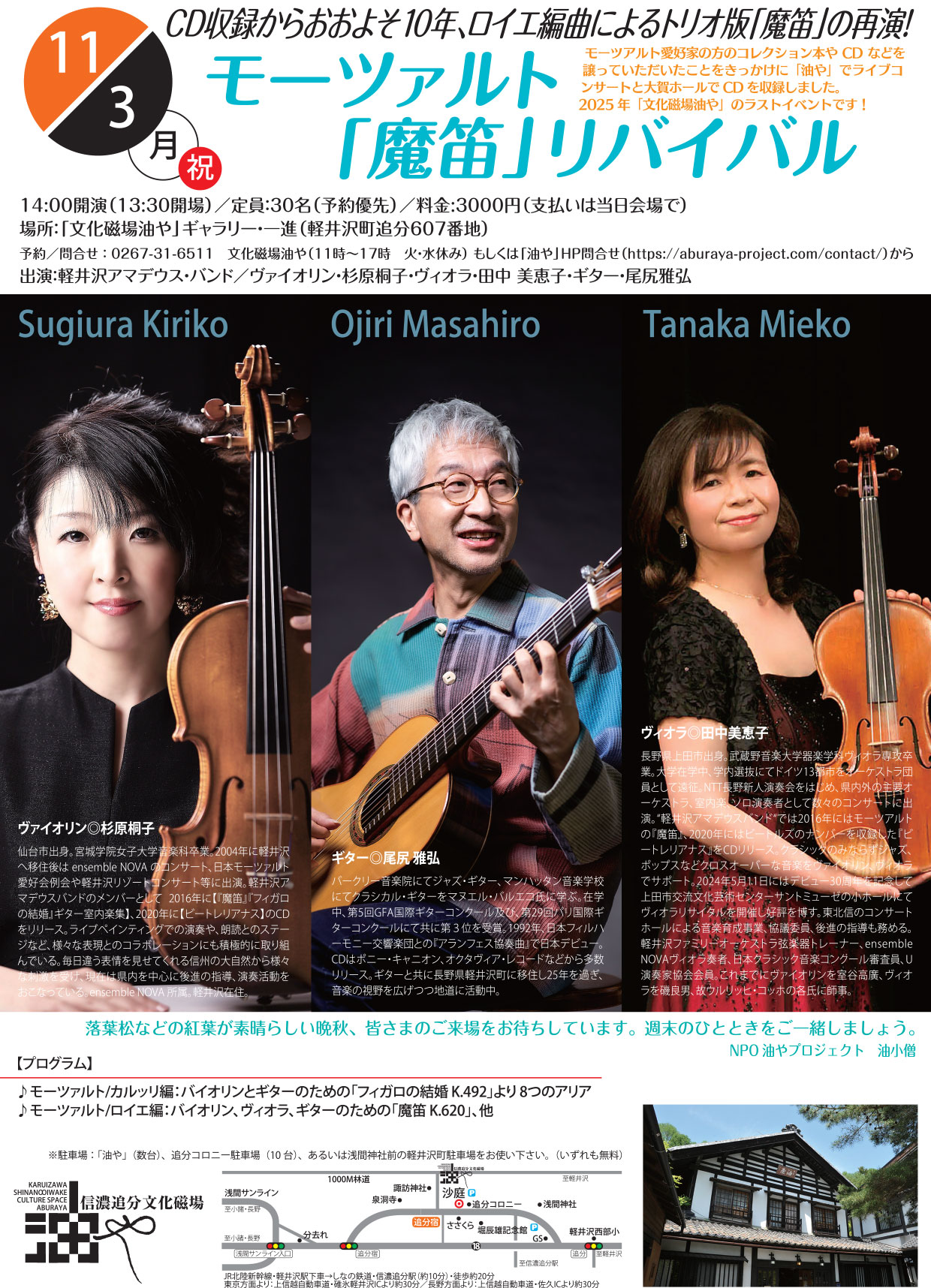 今般、2025年「文化磁場油や」のラストイベントとして、「モーツァルト「魔笛」リバイバル」コンサートを行います。